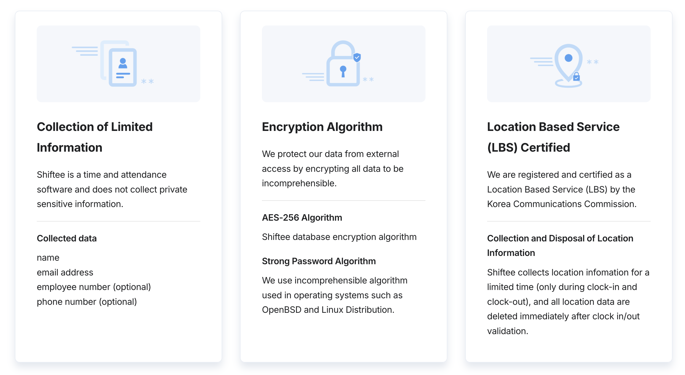 - Location data collected for clock-in/clock-out purposes is checked on a one-time basis only and immediately deleted — ensuring personal information is protected.