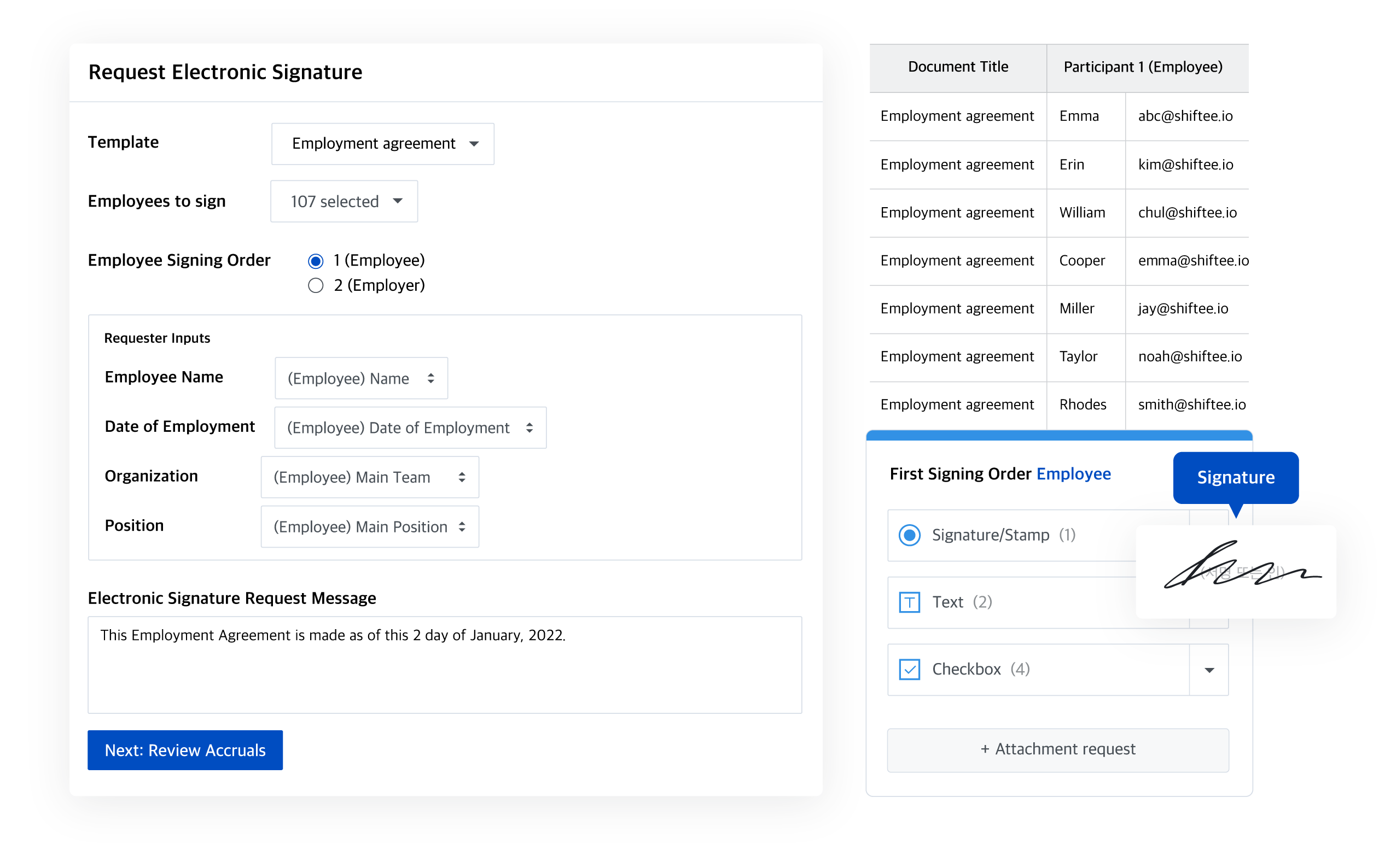 Shiftee provides e-signature and attendance management capabilities within a single integrated platform. Key features include: