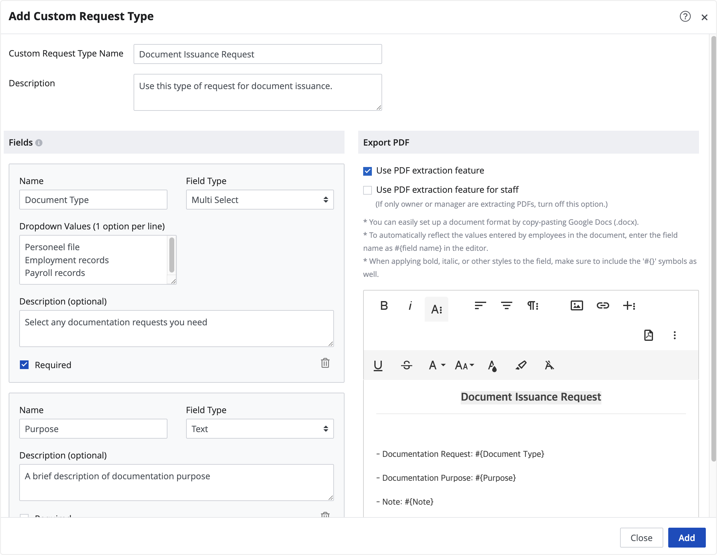 - Use PDF Extraction Feature for Staff : Choose to allow employees to export custom requests as PDF files. Employees can download the PDF directly from the requests menu when documents such as certificates are required.