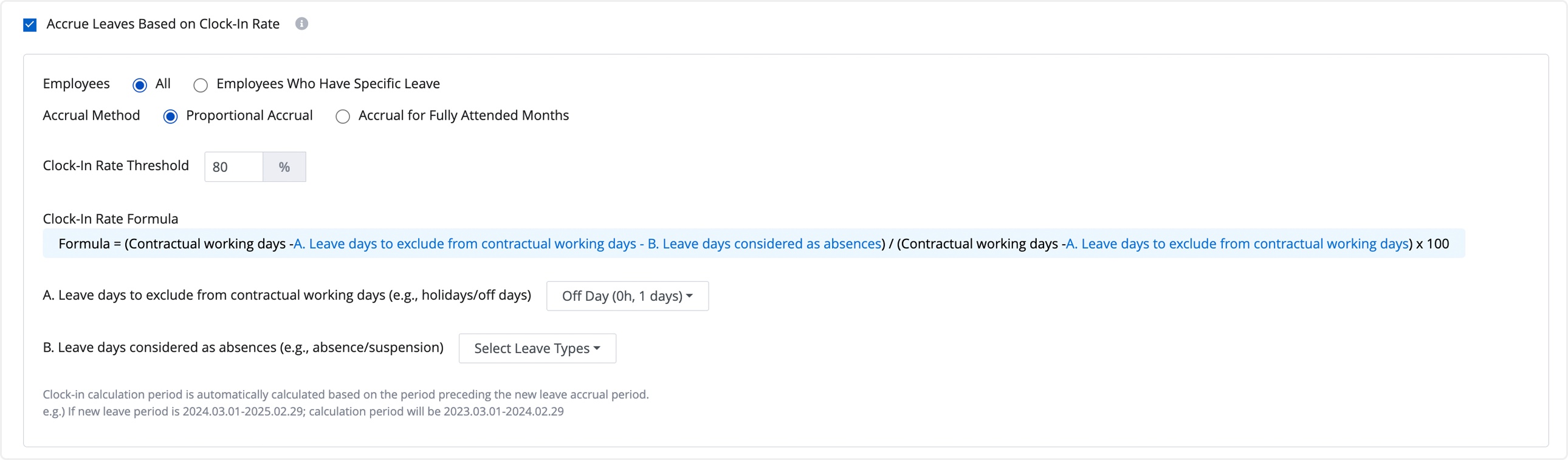 - At or above the set clock-in rate threshold: Full amount of total leave days is accrued according to the leave accrual rule.