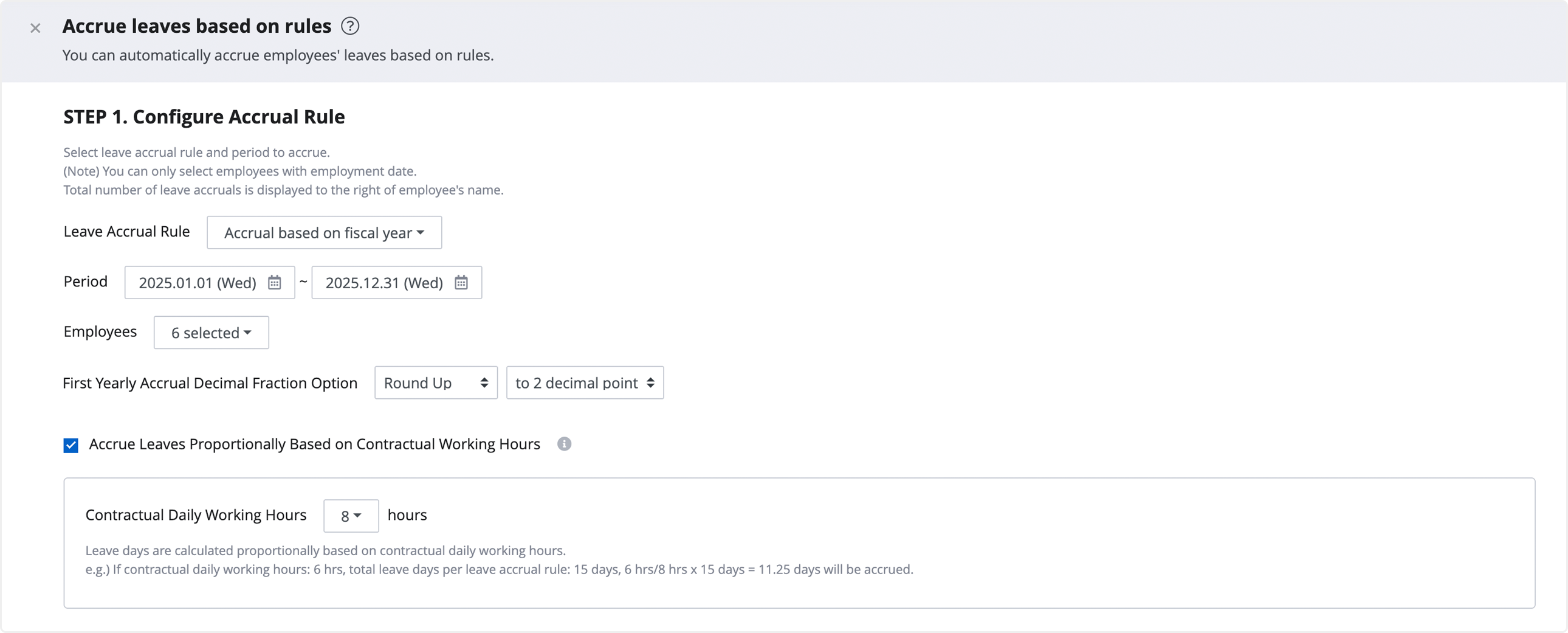 - e.g.) If the contractual daily working hours are set to 8 hours and an employee's contractual daily working hours are 4 hours, 50% of the total leave accrues.