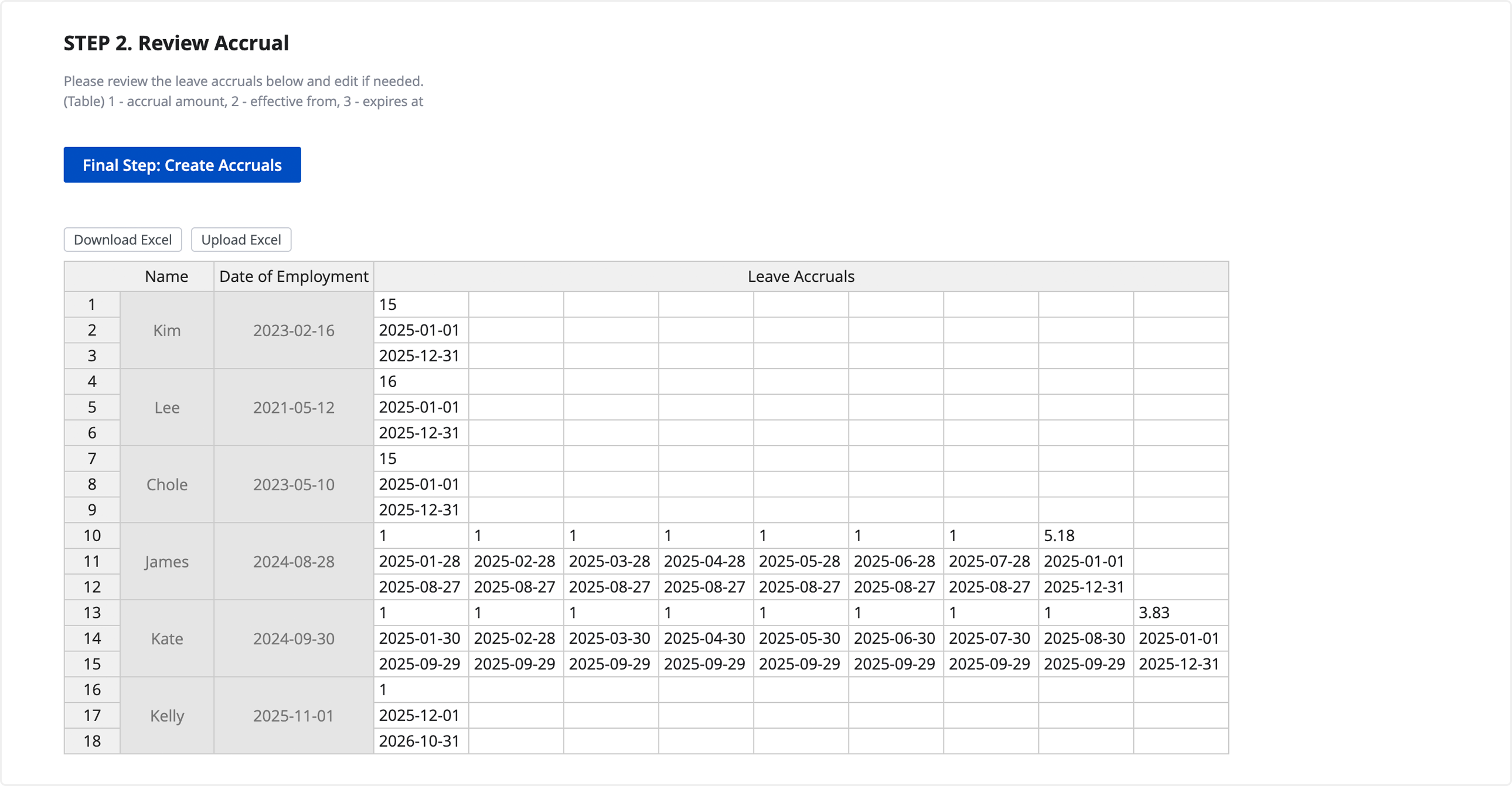 Click the Next: Review Accruals button to review the accrued leaves. Then, click the Final Step: Create Accruals button to complete the accrual process.