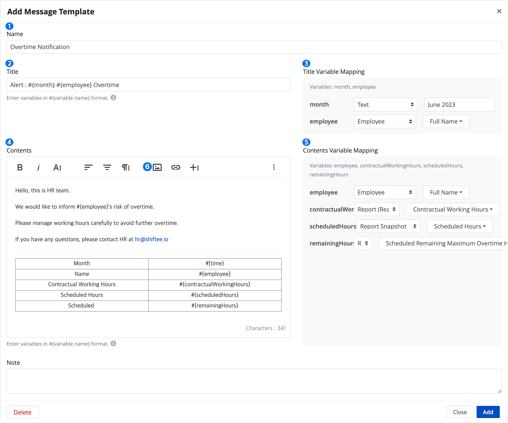 ⑤ Contents Variable Mapping : Set variable items in your message. The selected data is automatically inserted according to the recipient.