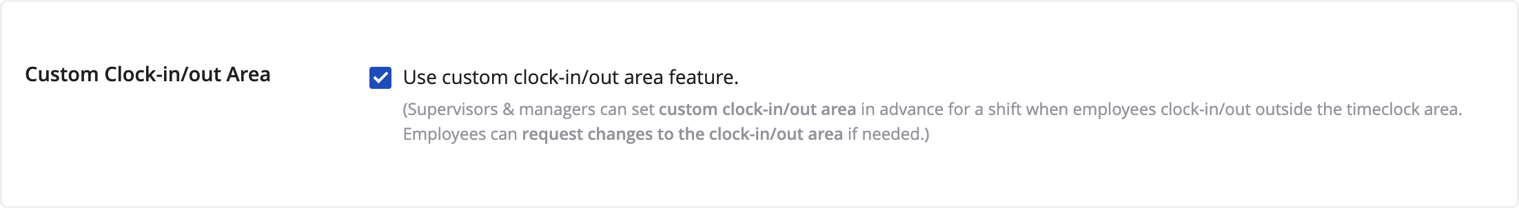 - You can manage offsite work by adding a custom clock in/out area for the shift.