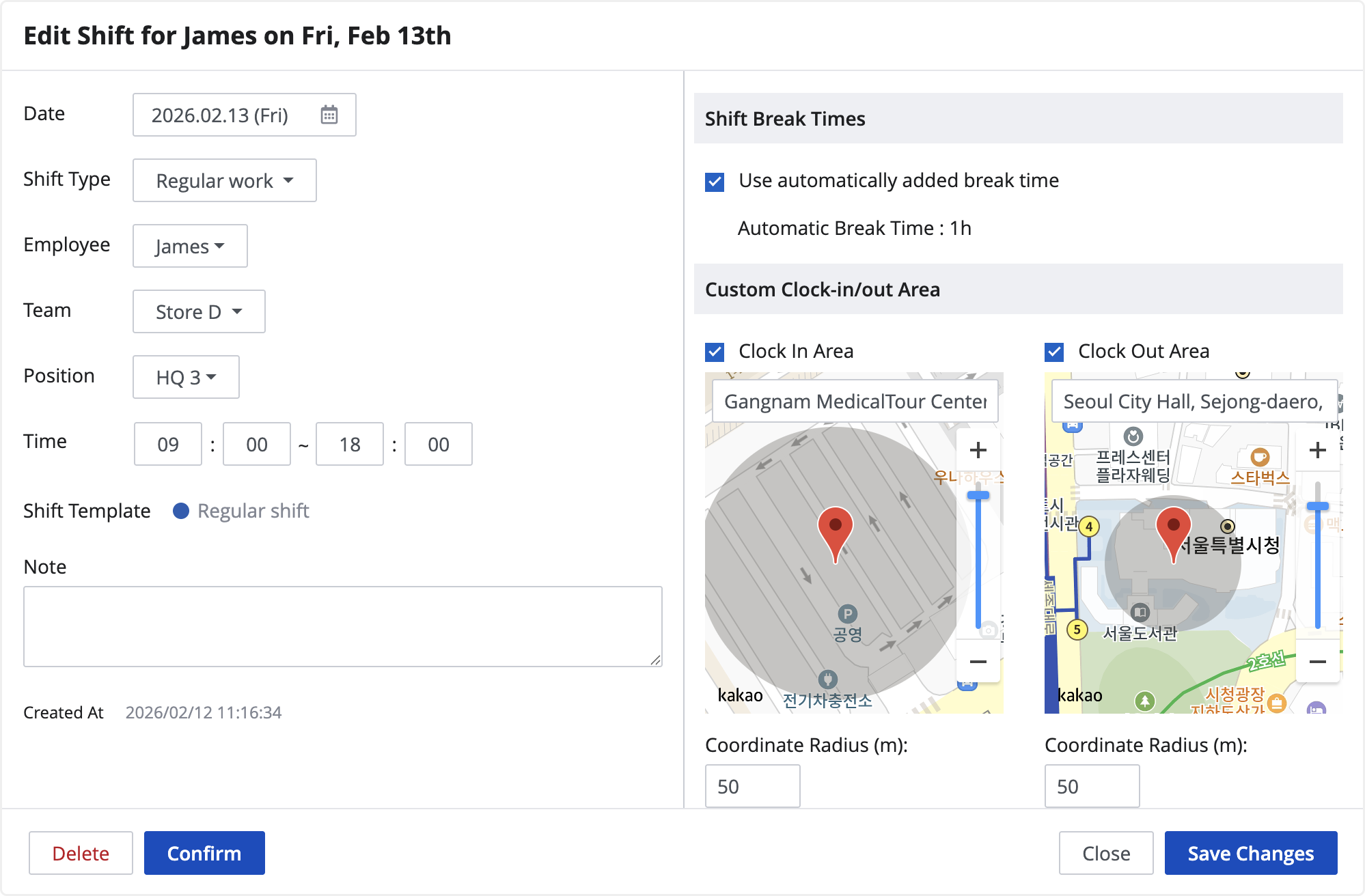 • You can adjust a radius of the coordinate; a boundary that employees can clock in and out.