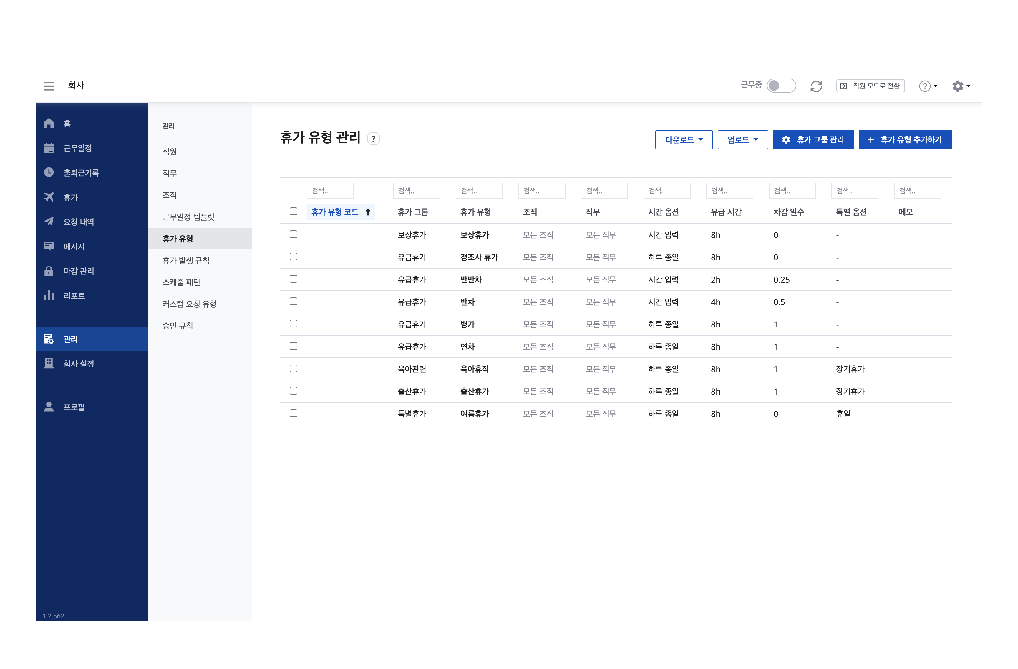 근로시간 단축 근로자 전용 근무 및 휴가 유형 설정 : 임신기 단축 근로자를 대상으로 1일 6시간 근무 유형을 관리하면서도, 연차 차감 규칙은 1일 8시간을 기준으로 유연하게 설정할 수 있습니다.