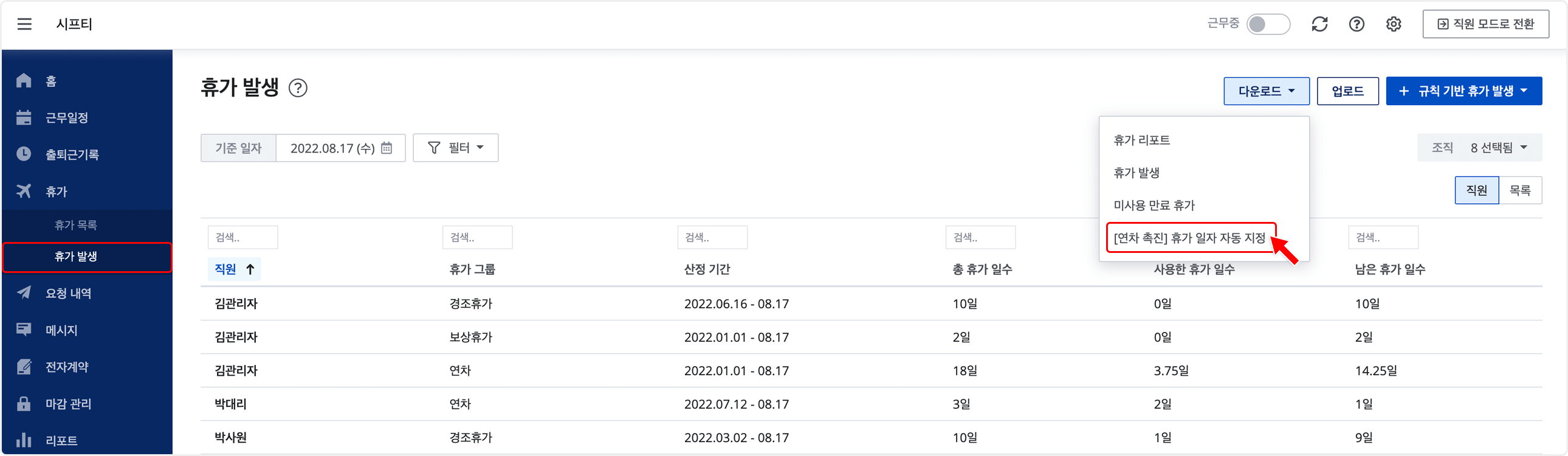 STEP 1 ) 휴가 발생 페이지 우측 상단의 다운로드 > [연차 촉진] 휴가 일자 자동 지정 버튼을 눌러주세요.
