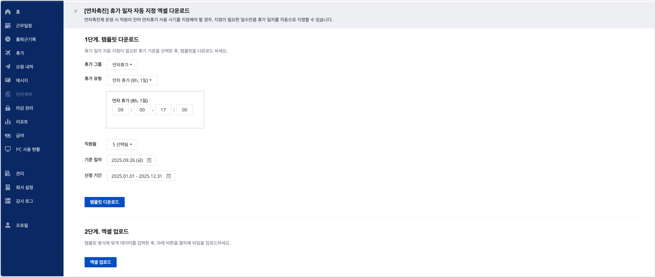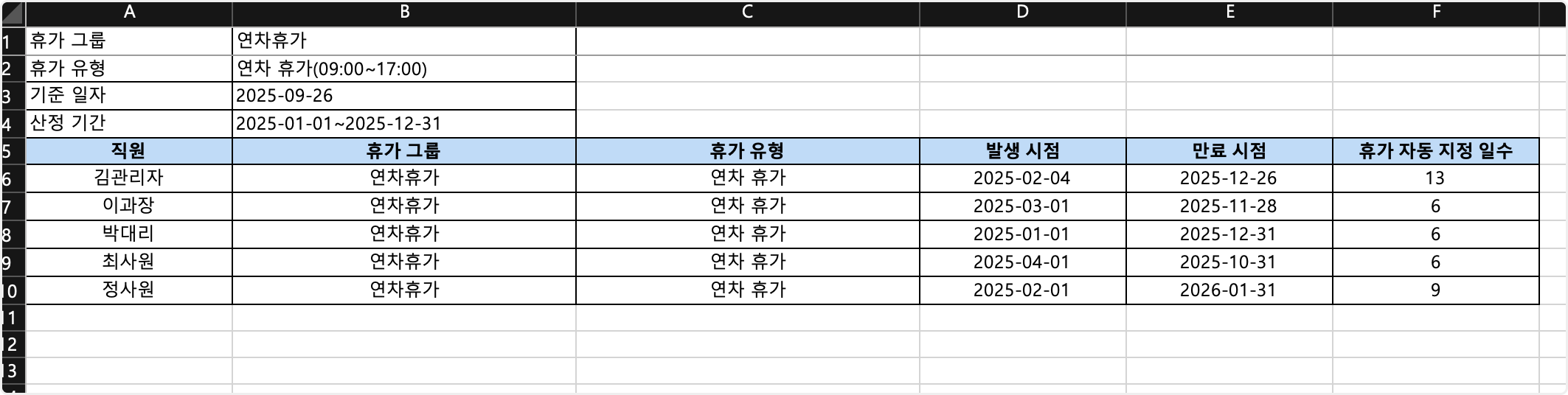 자동 지정 기능을 통해 직원의 잔여 연차에 대한 사용시기가 자동으로 지정된 내역을 엑셀로 다운받을 수 있습니다.