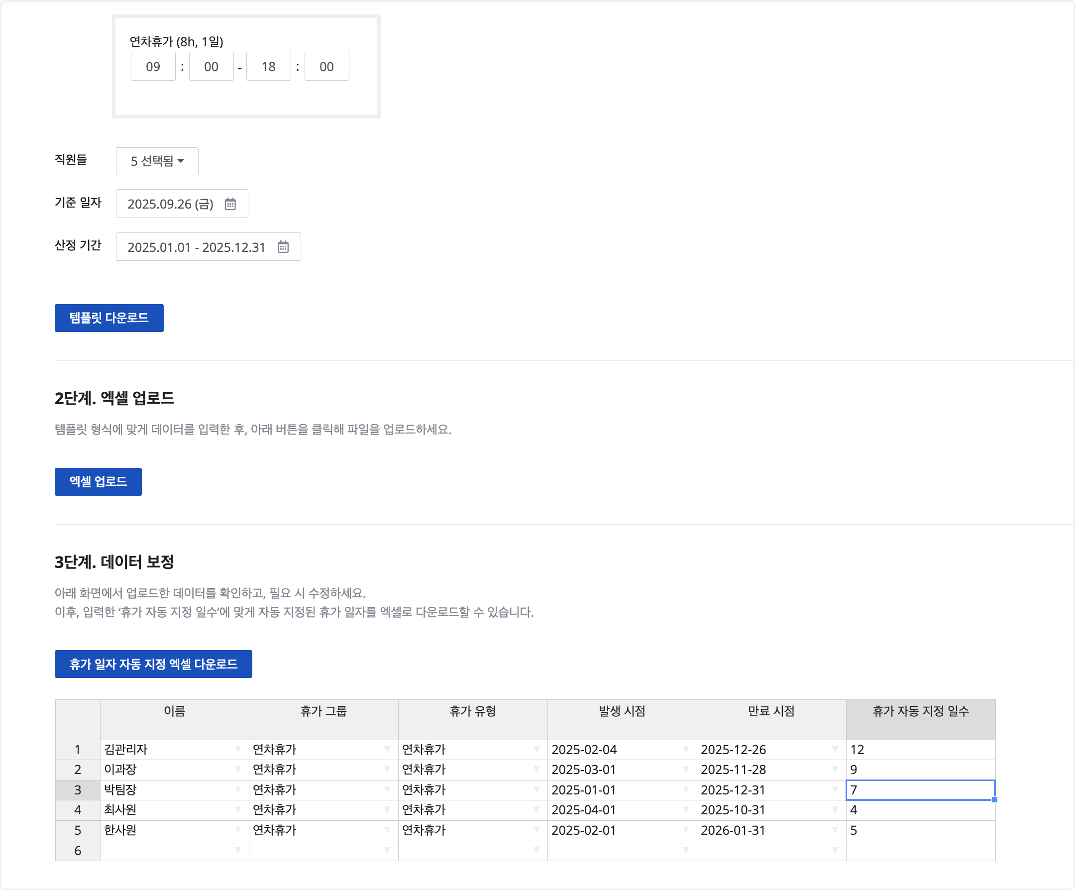 STEP 3 ) 템플릿 다운로드 시, 휴가 일자 자동 지정이 필요한 발생 건을 확인할 수 있으며, 잔여 휴가일수는 휴가 자동 지정 일수으로 반영됩니다. 휴가 자동 지정 일수를 확인한 후, '자동 지정이 필요한 일수 만큼'만 추가로 수정하여 반영할 수 있습니다.
