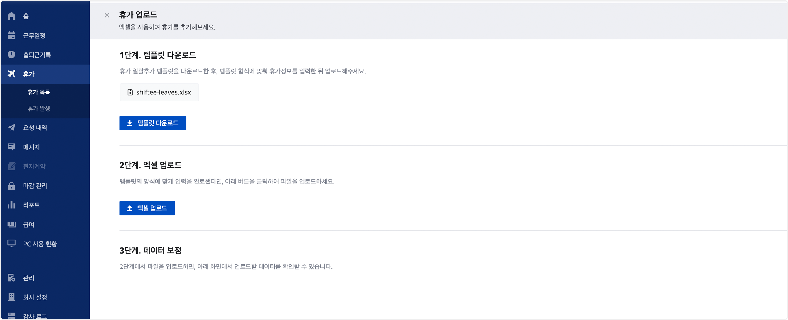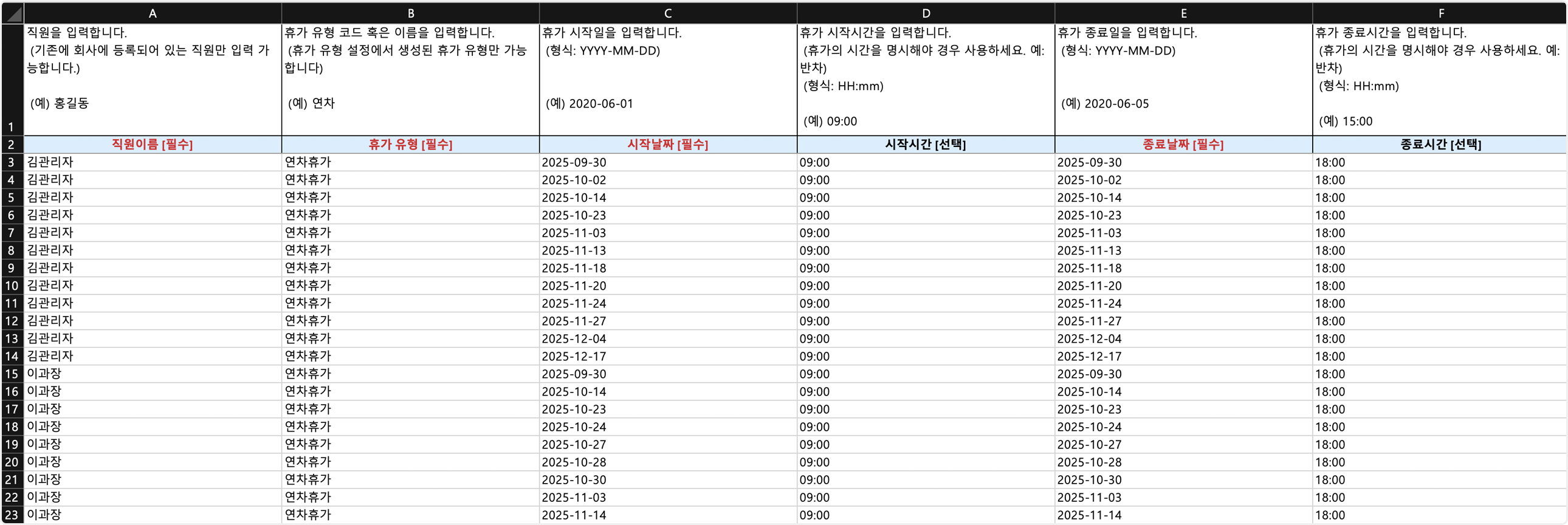 STEP 5 ) 다운로드한 엑셀 파일을 사용해 휴가 목록 > 업로드 > EXCEL 업로드에서 휴가를 등록할 수 있습니다.