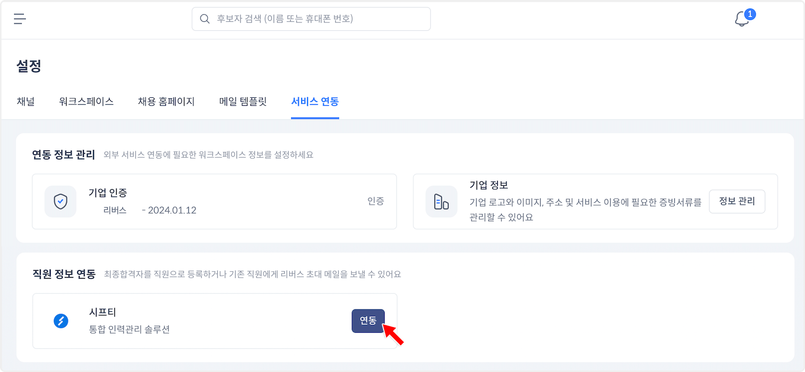 연동에 대한 설정은 최고관리자 권한으로 회사 설정 > 연동 메뉴에서 진행할 수 있습니다.