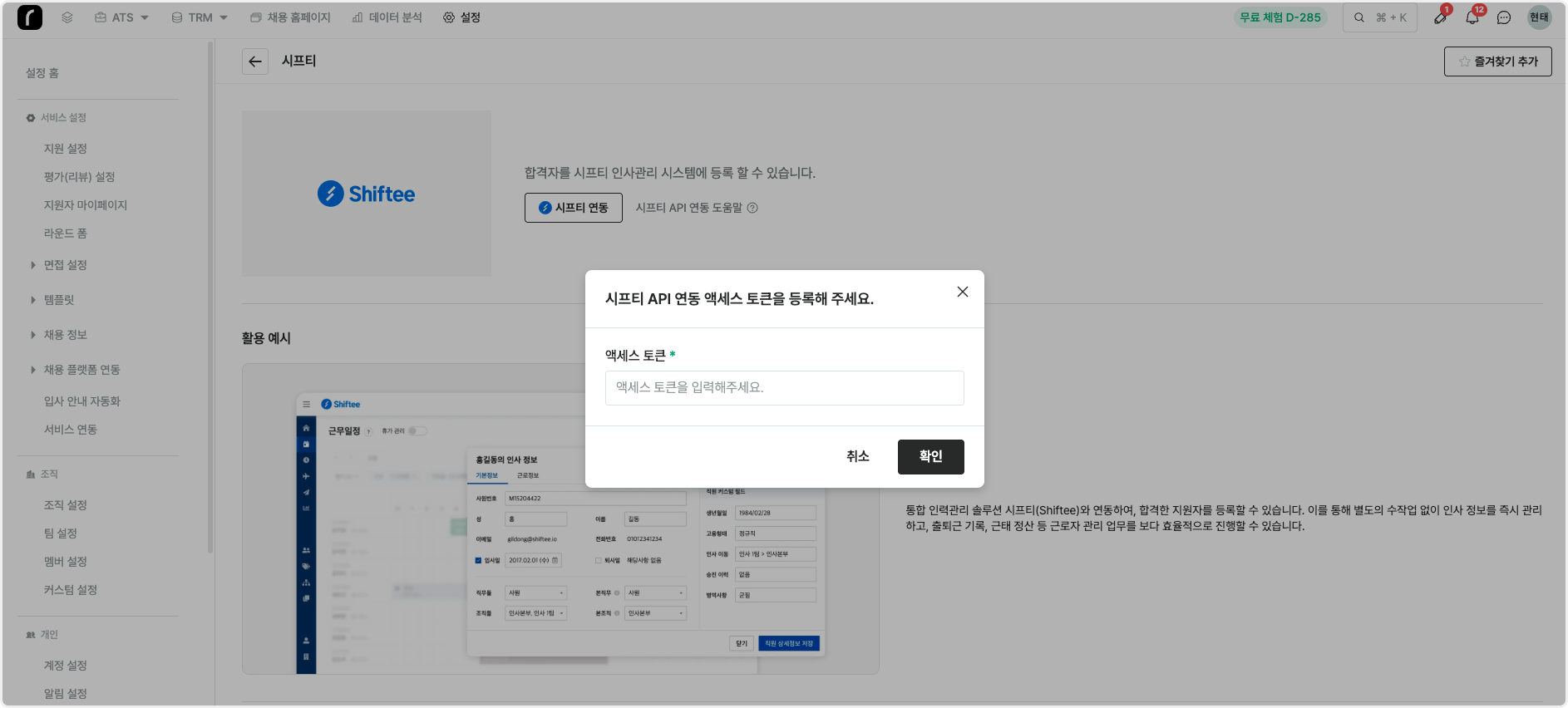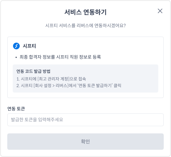 STEP 2 ) 라운드 HR의 관리자 페이지로 이동한 뒤, 시프티를 연동하기 위해 설정 > 서비스 연동 > 시프티 [연동하기] 버튼을 클릭해 발급받은 토큰을 입력하세요.