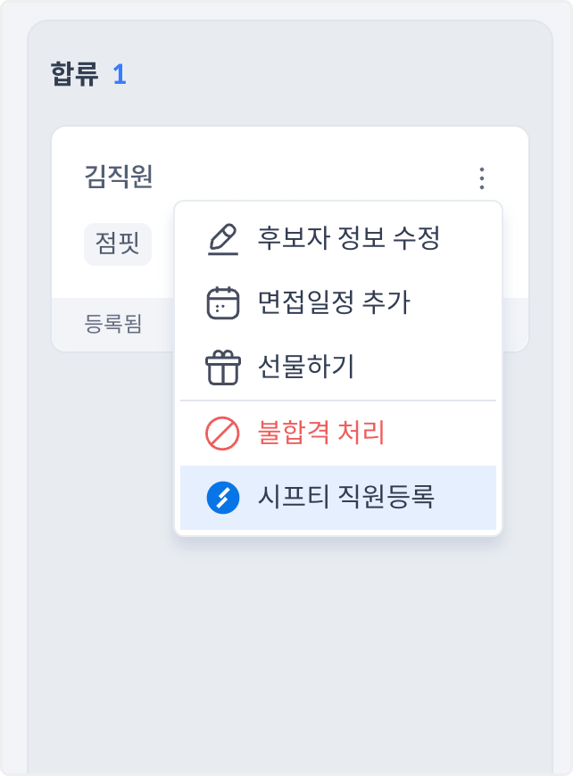 STEP 3 ) 연동 후, 합격한 지원자의 [더보기] 버튼을 클릭해 시프티 직원 등록이 가능합니다. 합격한 지원자의 인사 정보를 시프티로 불러와 직원으로 간편하게 등록할 수 있습니다.