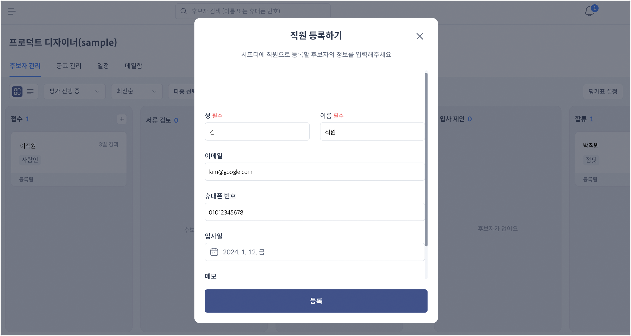 등록할 지원자의 정보를 등록할 수 있으며, 사원번호는 라운드의 지원자 번호로 부여됩니다.