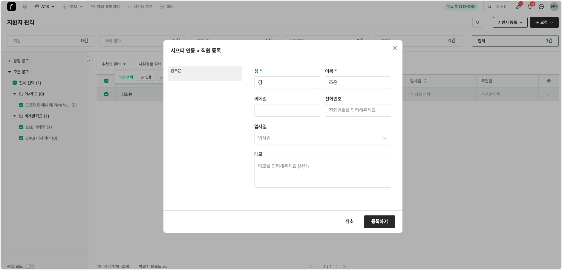 STEP 4 ) 연동이 완료된 이후, 최종 합격자를 시프티로 불러와 직원으로 간편하게 등록할 수 있습니다.