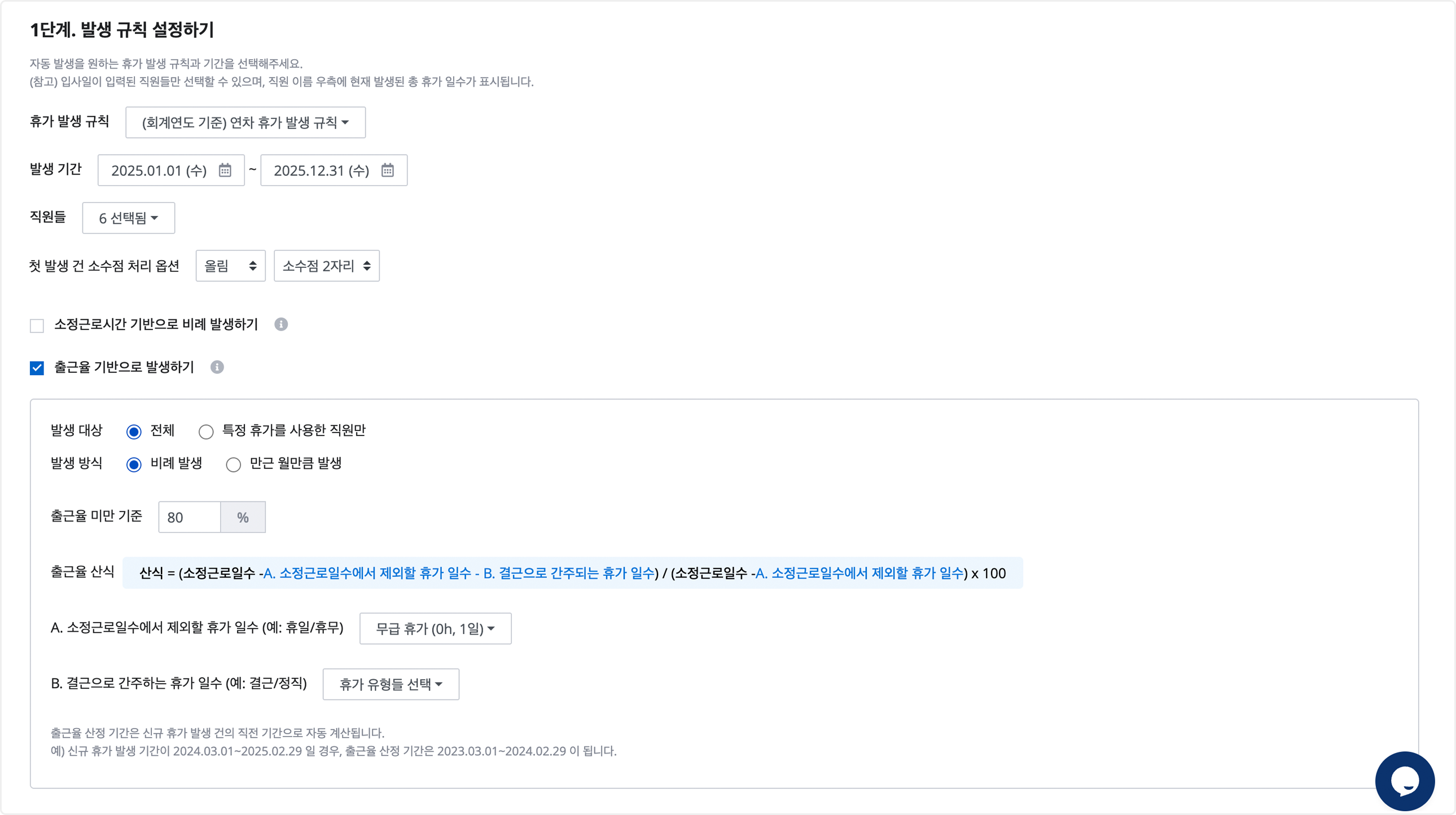 - 설정한 출근율 이상: 휴가 발생 규칙에 따른 총 휴가 발생 일수 전체 발생