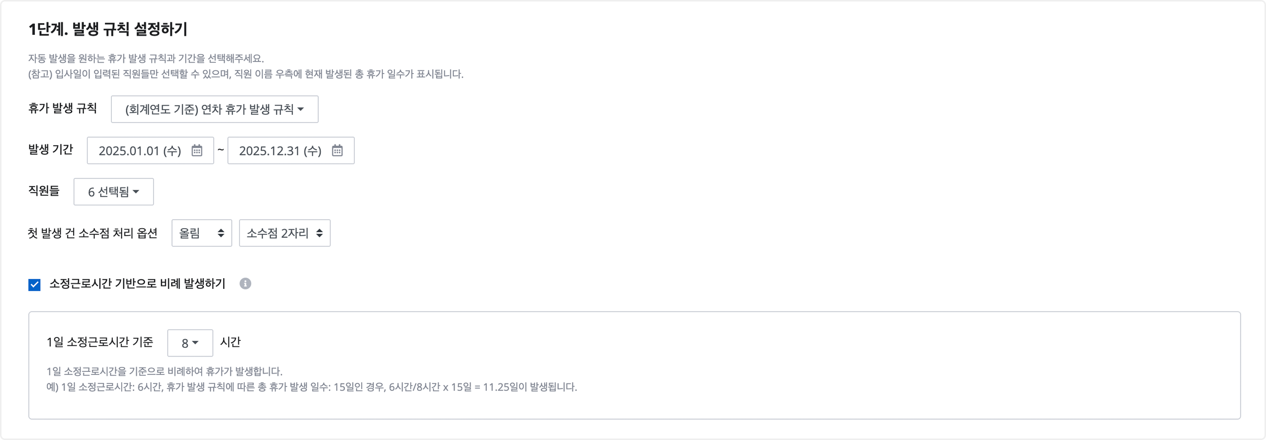 - 예) 설정한 1일 소정근로시간 기준이 8시간일 때, 직원의 1일 소정근로시간이 4시간인 경우: 총 휴가 발생 일수의 50%만 발생합니다.