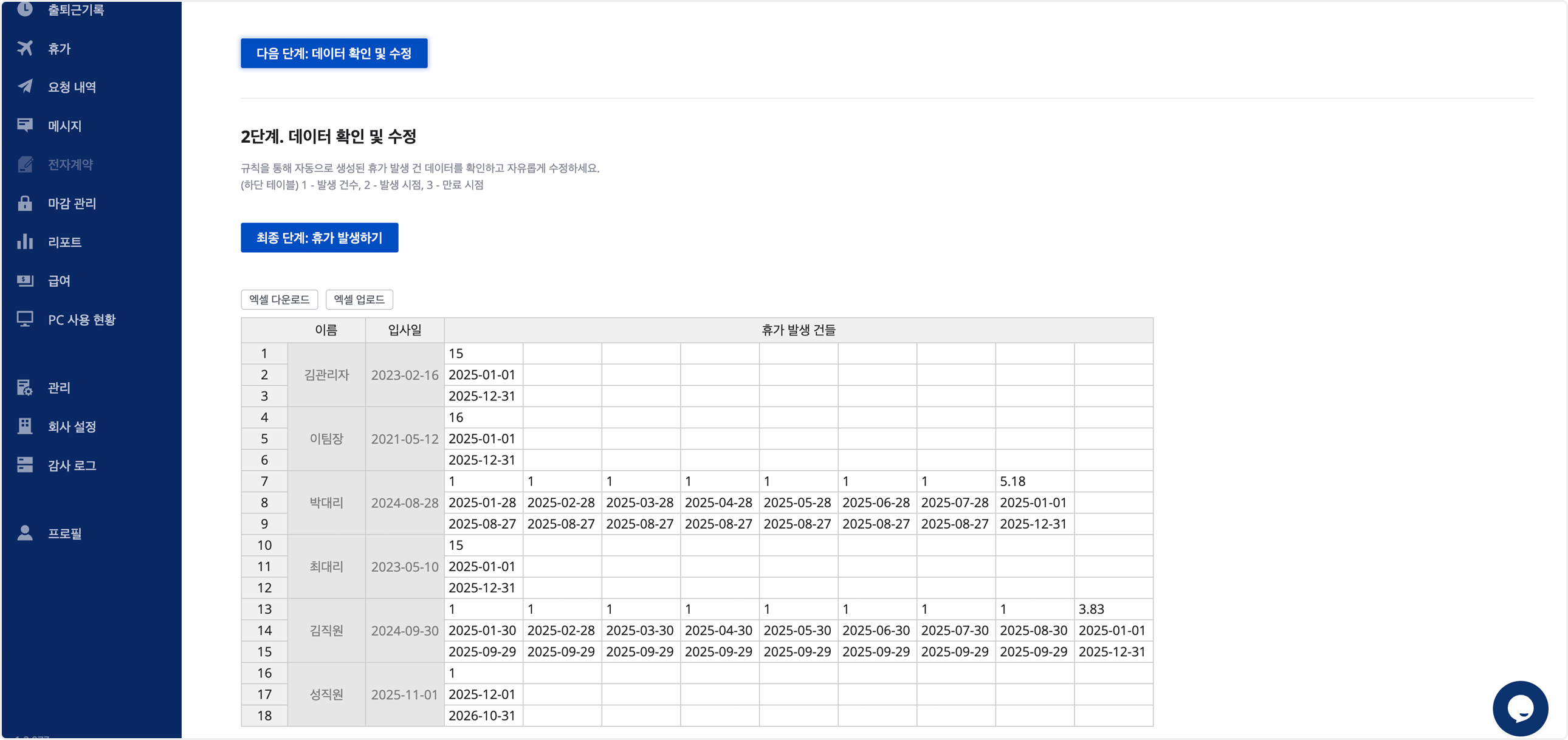 다음 단계: 데이터 확인 및 수정 버튼을 눌러 휴가 발생 건들을 확인할 수 있습니다. 이후, 최종 단계: 휴가 발생하기 버튼을 눌러 휴가 발생을 완료하세요.