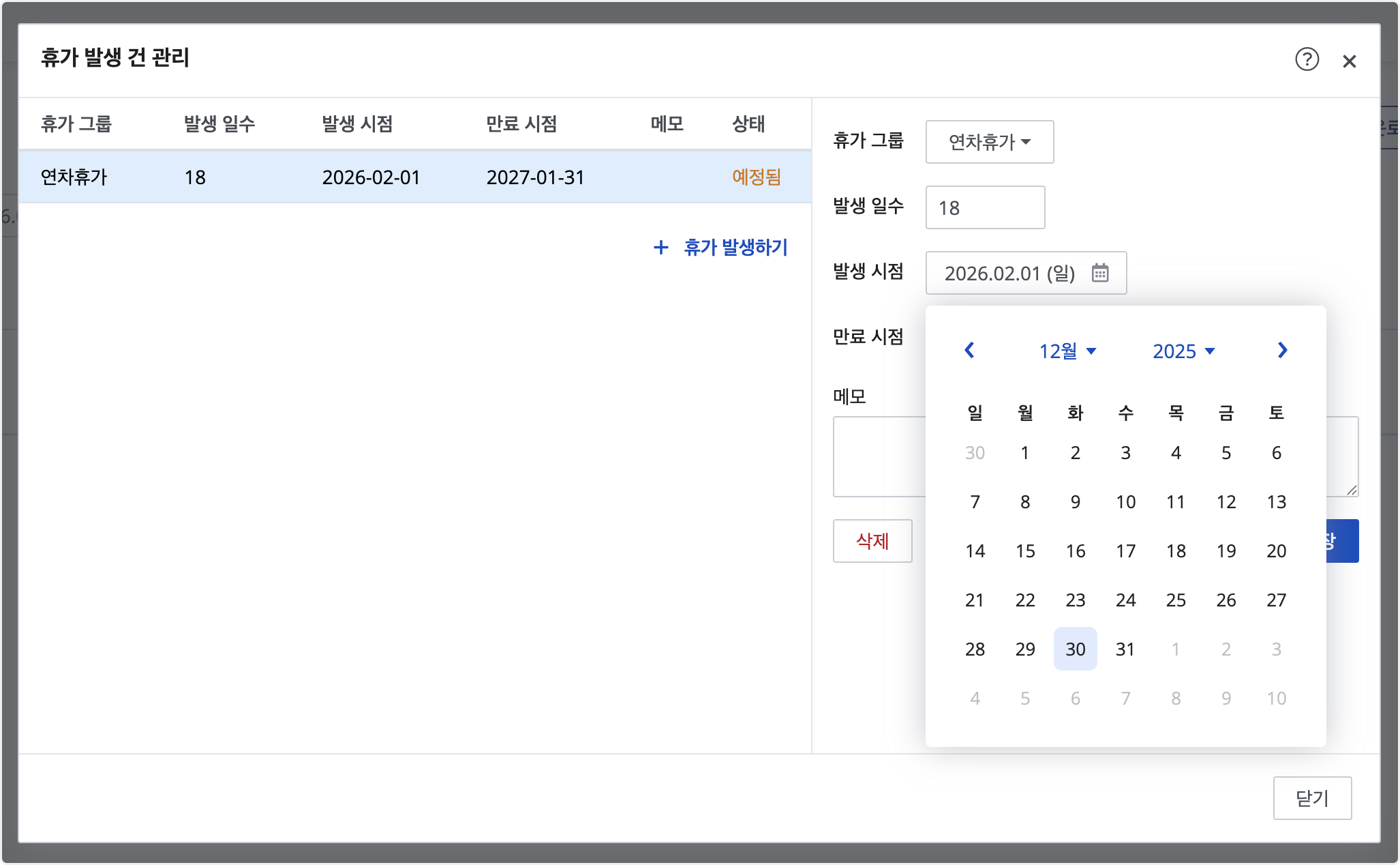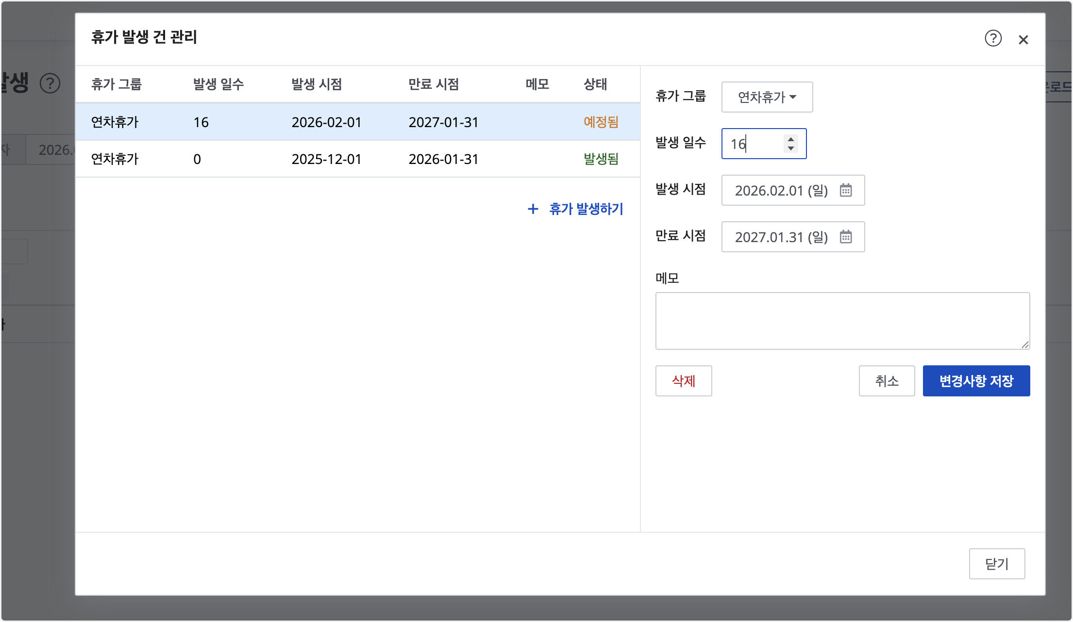 따라서, 과거 사용분을 반영하려면 발생 예정인 연차 휴가의 '발생 시점'을 휴가 사용일 또는 그 이전 날짜로 설정해주세요.