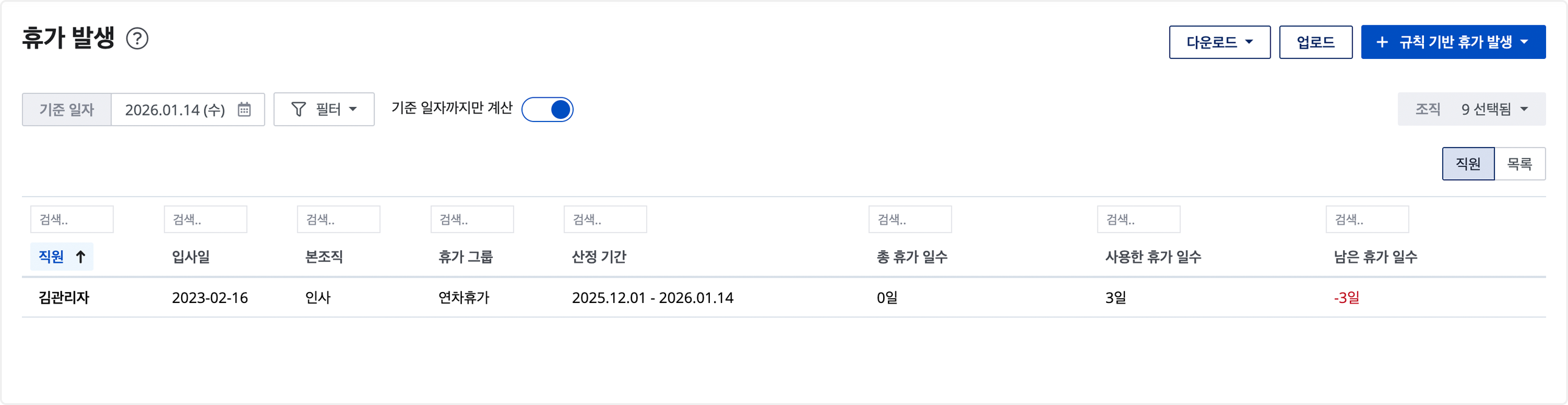 직원이 휴가 발생 전 휴가를 초과 사용한 경우(연차 당겨쓰기, 마이너스 연차 등), 발생 예정 건에는 과거 사용분이 '사용한 휴가 일수'로 자동 반영되지 않습니다.
