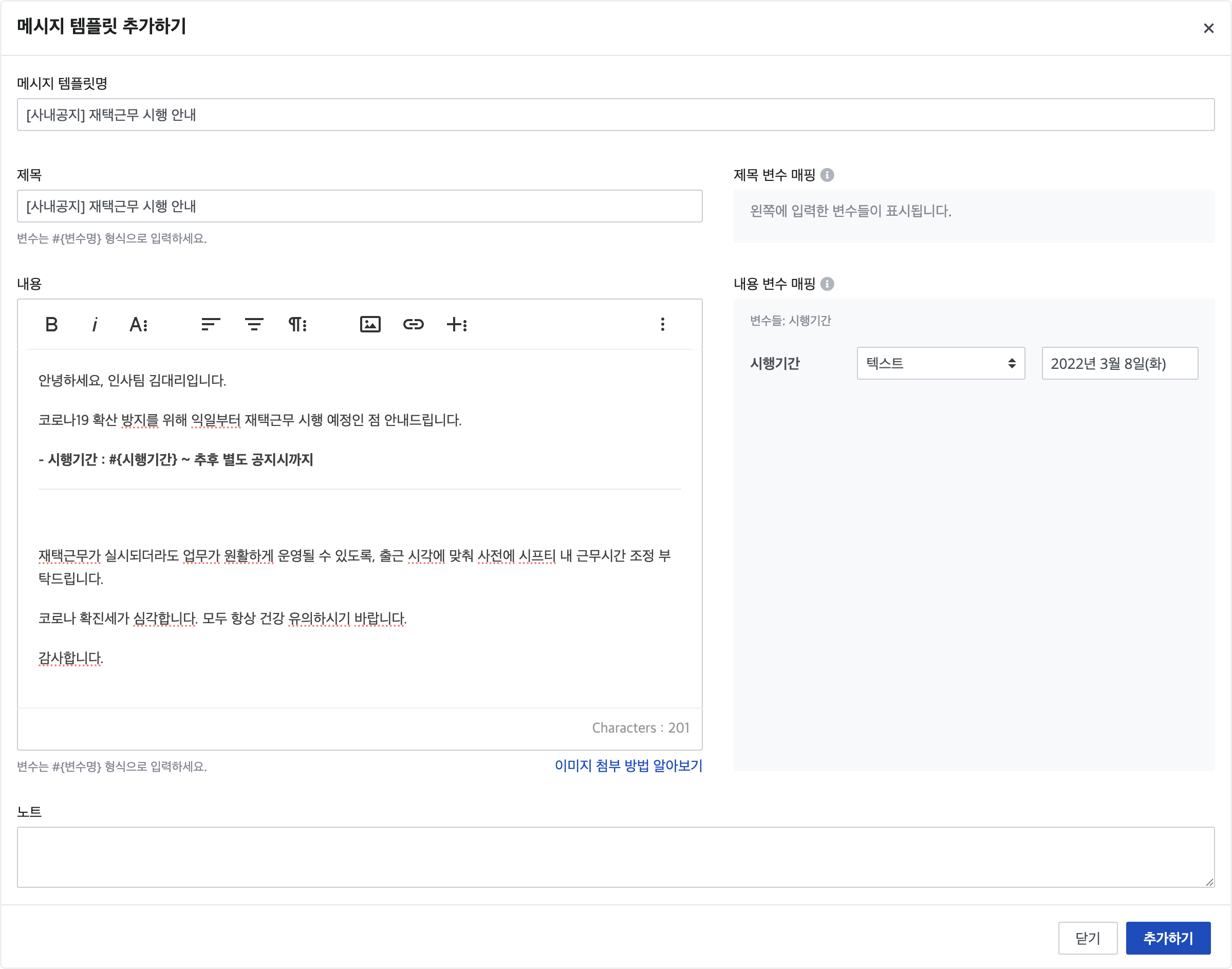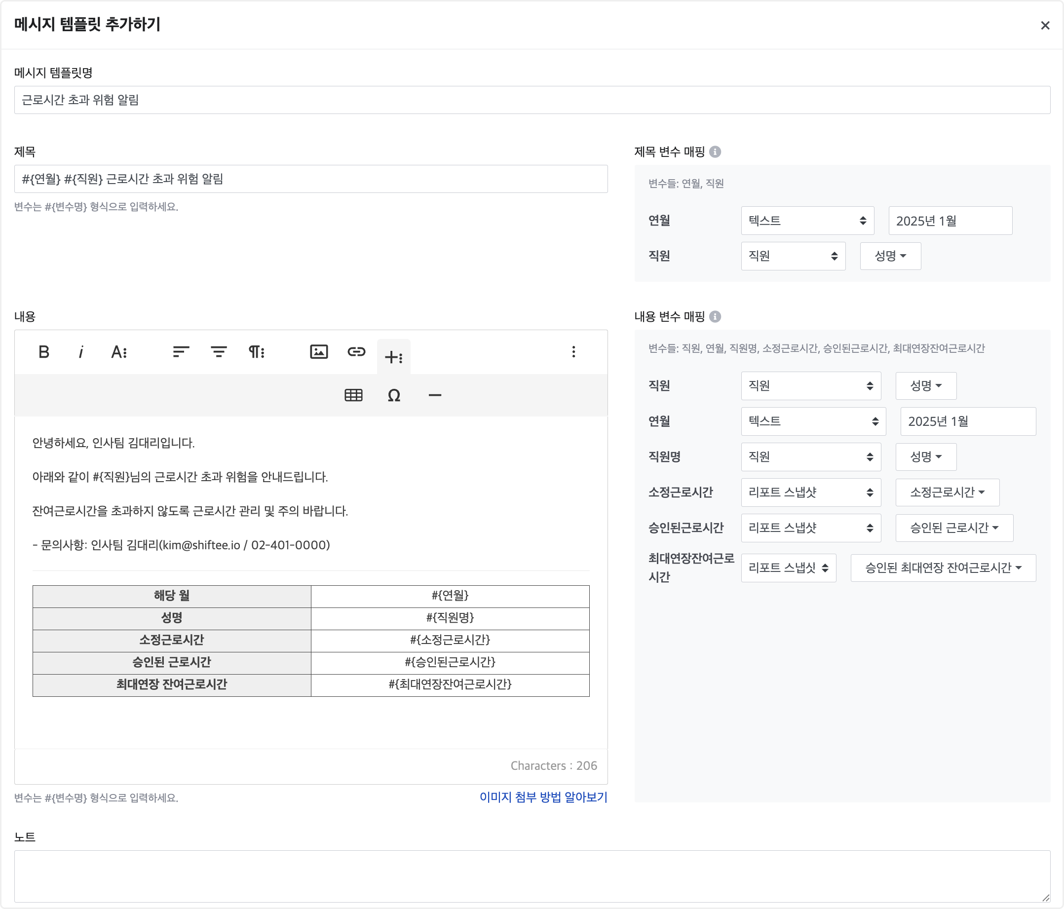 예) #{연월} #{직원} 근로시간 초과 위험 알림