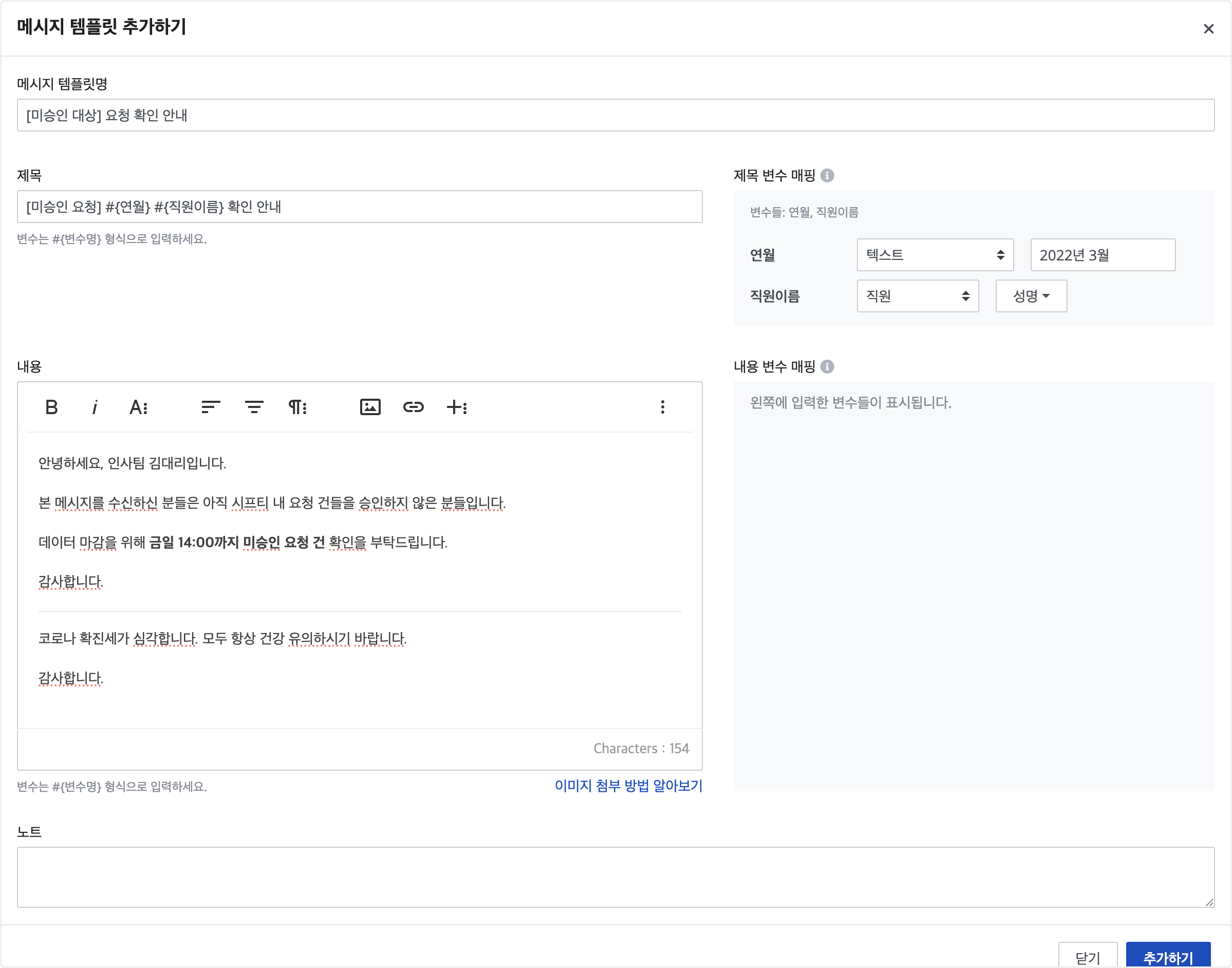 예) [미승인 요청] #{연월} #{직원이름} 확인 안내