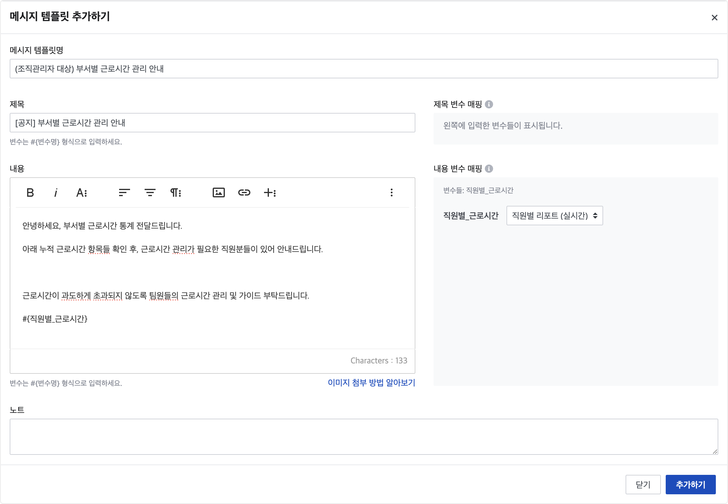 예를 들어, '부서별 근로시간 관리 안내'에 대한 메시지 템플릿을 생성해보겠습니다.