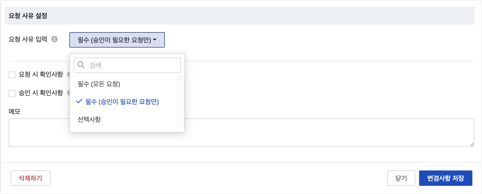 요청 시 사유 입력에 대한 필수 여부를 상세하게 설정할 수 있어, 사내 규정에 맞는 세부적인 요청 관리가 가능합니다.